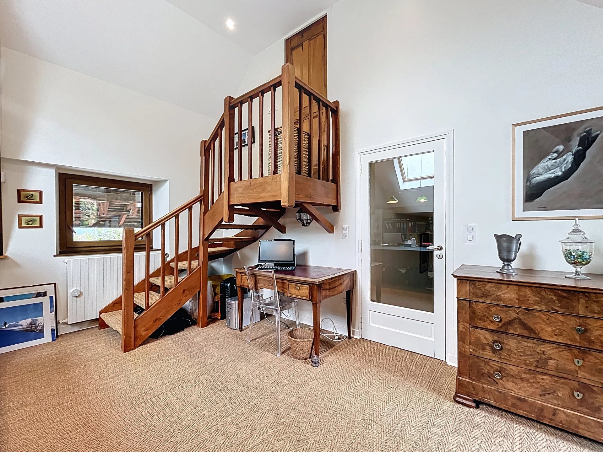 A l'étage, une mezzanine accueille un espace bureau, sur un demi niveau, une chambre vient compléter cet espace.